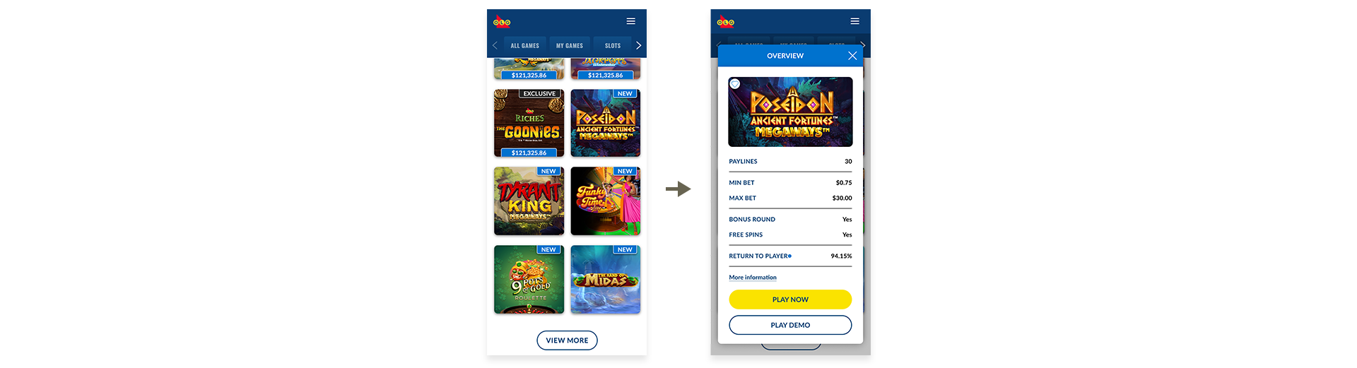 Similar to the desktop experience, tapping on the game tile will trigger the pop-up modal to open. Compared to the previous setup, this eliminates the hassle of constantly navigating between the game info page and the casino lobby, making the experience more seamless and convenient.